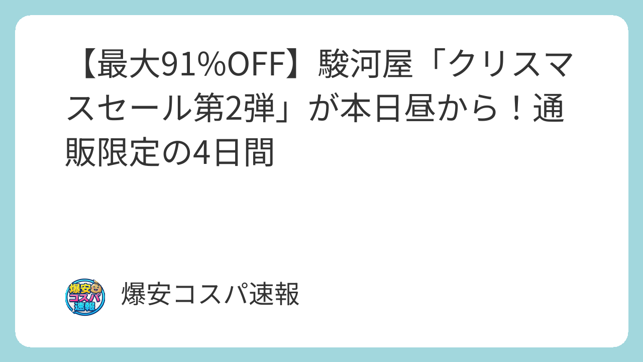 ホビーや中古グッズでおなじみの駿河屋で、通販限定の**「クリスマスセール第2弾」がスタートしています。 期間は12月8日(月) 12:00 ~ 12月11日(木) 23:59**までの4日間限定です。